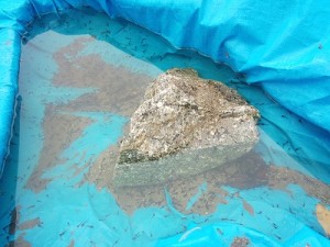 汚れみたいに見える黒い点全てがオタマジャクシです。 両生類の強みを垣間見た気がするのですが、このままではブルーシートがたためないので、オタマジャクシは近くの小川へ逃がしました。