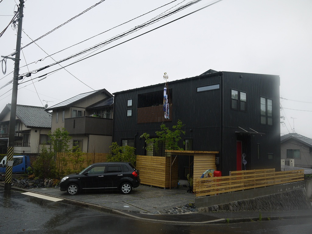 外壁の黒と無垢材で統一されたフェンス、駐輪場が印象的な仕上がりになりました。