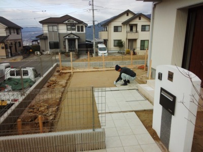 多かった土を鋤取り、砕石を入れ最後にクッション砂を入れています。 下地が整えば後はインターを貼っていく作業になります。