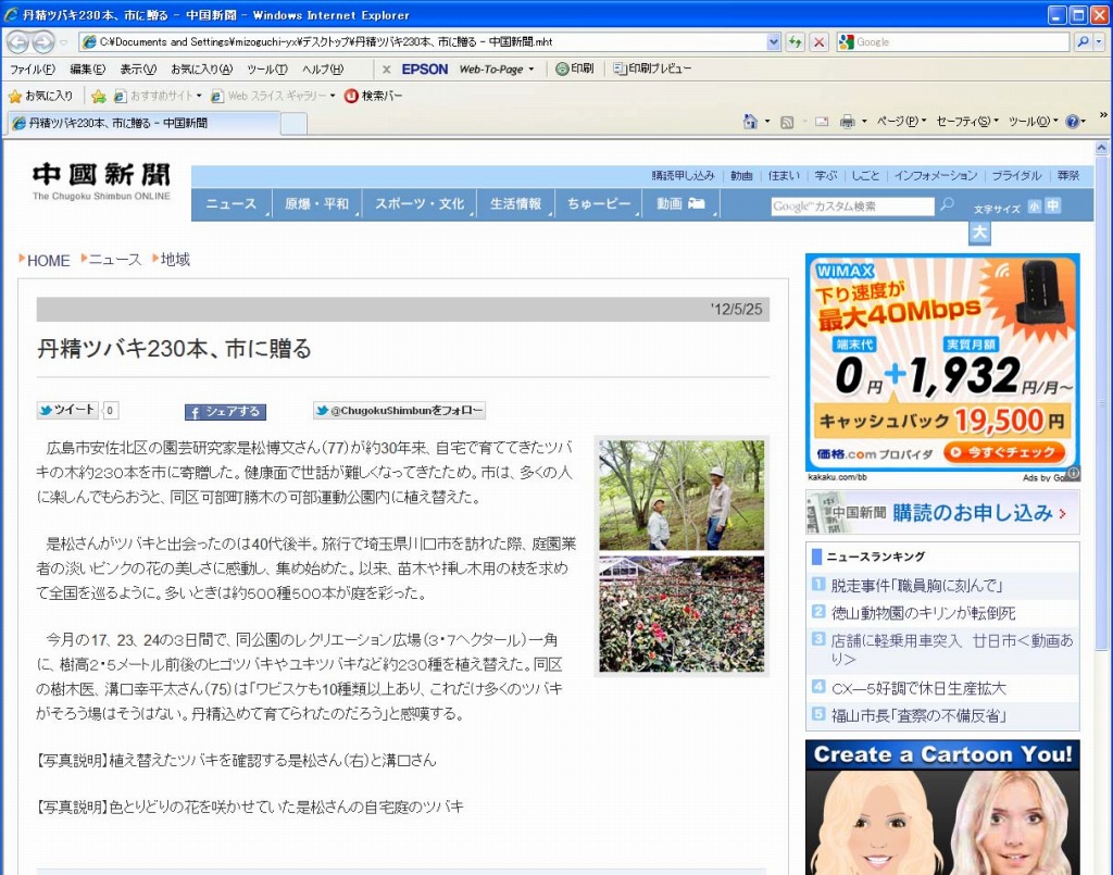 | 丹精ツバキ230本、市に贈る | 2012年05月25日 | 中国新聞 |