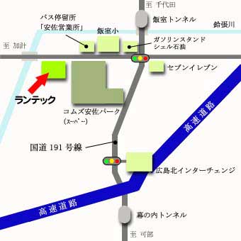 カーナビをご利用の場合には、電話番号検索で[082-835-0139](ランテック)を入力してください。