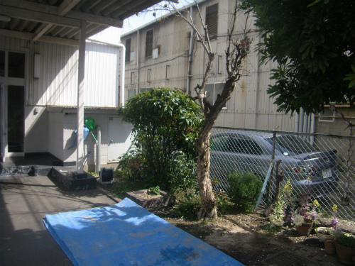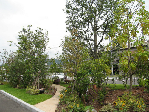 建物側から植栽スペースを見たところです。 旧工場より移植したカリンも元気に育っています。 |