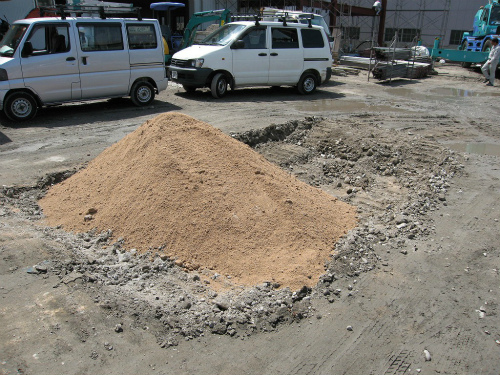 土壌改良材を搬入しています。 大量の土壌改良材を混入するため、その分の土量増加を見越して客土量を決めなければなりません。 |