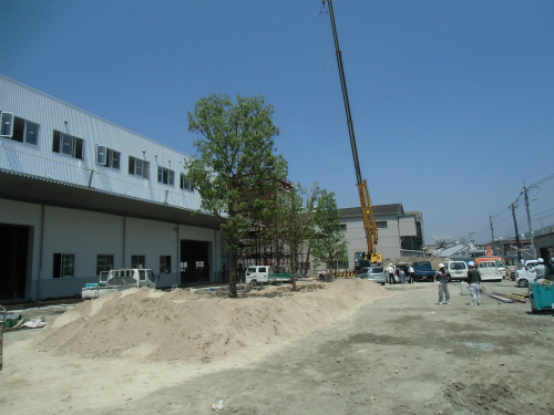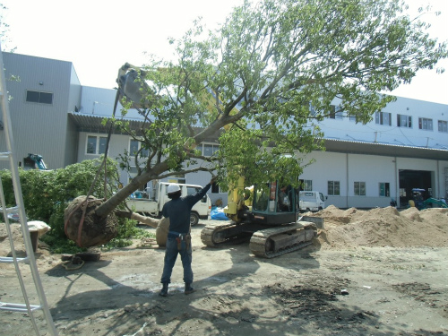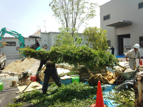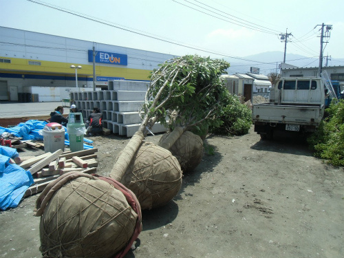 先行植栽する大きな樹木を荷卸ししたところです。 これだけ大きな樹木を植栽するのは久しぶりでした。 これ以上大きな樹木になると、道交法上面倒な手続きが必要となってきます。 |