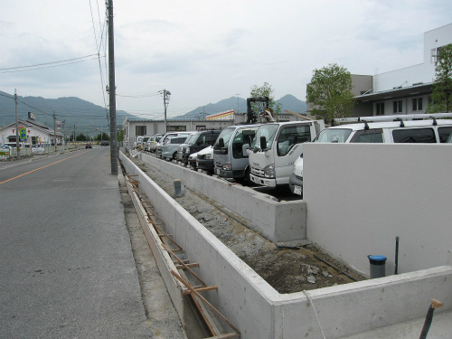 外構部分の植栽マスも完成しました。 周囲の地盤より高くなっている植栽マスは、周囲から水分が供給されないため、灌水と土壌改良が重要となります。 |