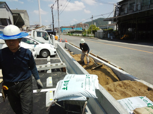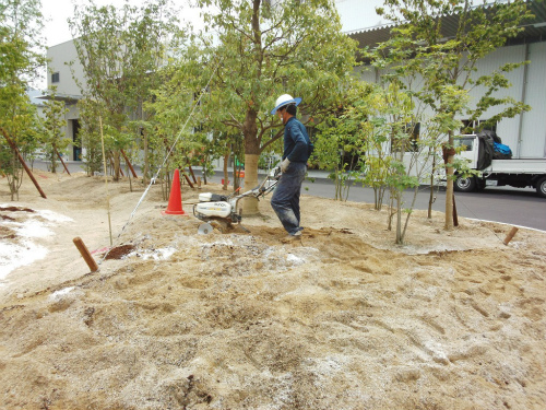 芝生用の土壌改良を実施しているところです。 植栽スペースの周辺部にはコウライシバを張っていますが、きれいな芝生をつくるには、土壌改良がとても大切です。 |