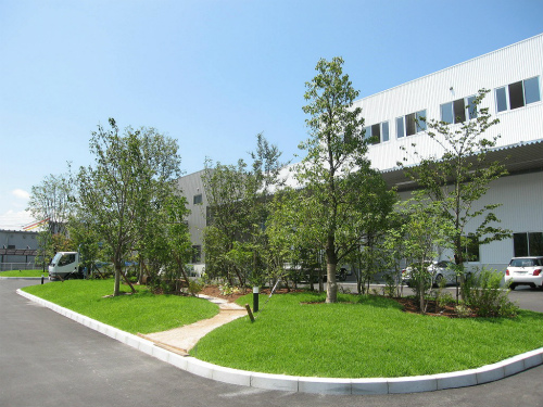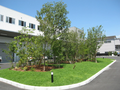 反対側から見たところです。 建築物が大きく圧迫感があるため、それを抑えるよう多くの緑量を確保しました。 いい時期だからではありますが、コウライシバがとても綺麗に健全に育っています。 きっと西井製作所さまのお手入れが十分に行き届いているからだと思います。 |