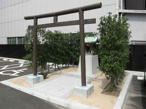 旧工場の屋上にあったお社も移転してきました。 性質が強健なウバメガシで、お社を守るように囲いました。 お社に近づくための板石園路も設置いたしました。また、雑草の発生を防ぐために真砂土舗装をしております。 |