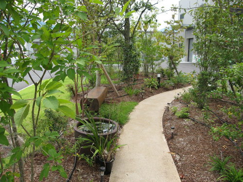 真砂土舗装の園路沿いに、大きな睡蓮鉢とベンチを設置されていました。 もう少し樹木が大きく育てば、恰好の休憩場所になると思います。 |