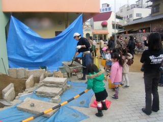 何にでも興味を持つ子供達が、すぐに寄って来ます。 作業中でもドンドン質問してくる子供達は、作業の進捗には影響を及ぼしましたが、作業員の楽しみでもありました。 普段は人に見られながら仕事をすることなんてありえず、子供達の視線を感じながらの作業は、それぞれに良い刺激となったようです。 |