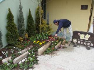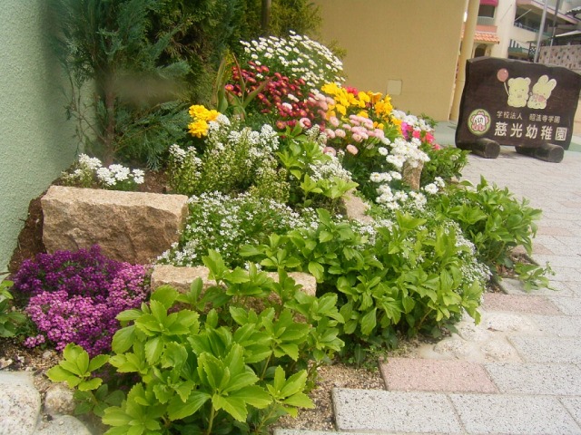 | 中区吉島にある幼稚園で、階段横のスペースをガーデニングにより修景いたしました。 建築物が幼稚園のため、パステルカラーなどの暖かい色が使われており、それに映えるようコニファー・花苗の色合いに気を使いました。 また、開園している幼稚園での作業となったため、安全の確保には注意を払いました。作業中・作業後とも、必ず作業場を安全コーンで囲むとともに、現場にはモノを置いて帰らないようにしました。 【慈光幼稚園WEBページ】 |