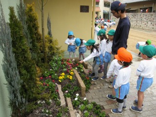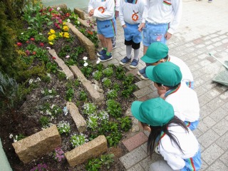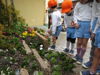 | 最後は水やりと掃除です。それが終われば完成です。 | オレンジ組の子供達が寄ってきました。町っこだからでしょうか、草花をあまり見たことが無いようです。 草花は地面に植えても良いのですが、鉢・プランターに入れてベランダで楽しむこともできます。 |