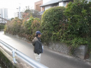 | 高さ2.5m程度の樹木です。植え込む前に剪定を行なっておきます。 | 外周フェンスです。フェンスの外側にも植栽ができるよう、位置を決めています。 | |