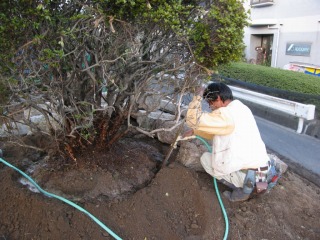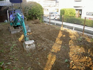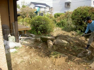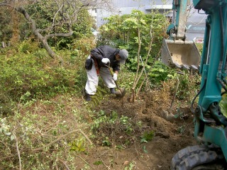 | 不要な樹木の伐採からはじめます。 | 新しいお庭で使用できる、育ちの良い植木は掘り取っておきます。 | |