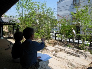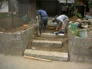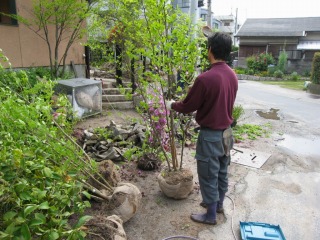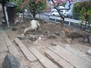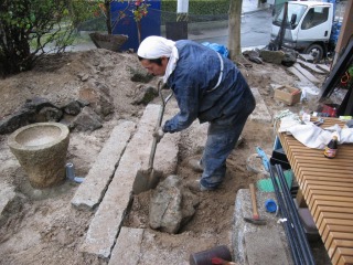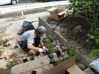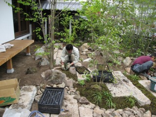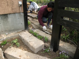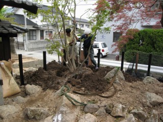 | アプローチ部分のゴロタ石張りです。 | 植栽は、大きな樹木から順に行なっていきます。 | |