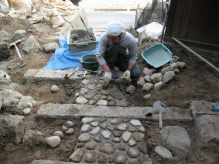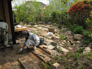 | 整地を施した上に、自然石を配置していきます。 | 自然石も大きなものから小さなものへ、順番に配置していきます。 | |
