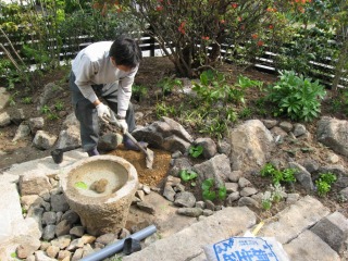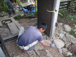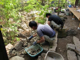 | 自然石を据え付けています。完成形を想像しながら、適切に配置していきます。 | 石を据えた後は、向きなどが変わらないように、小石、土を詰めていきます。 | |