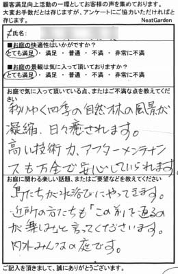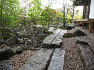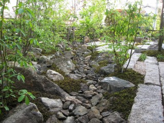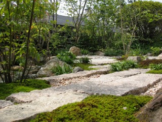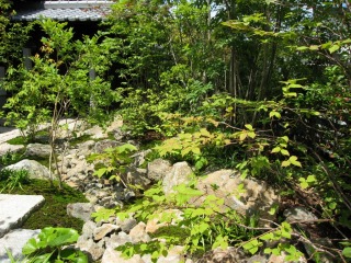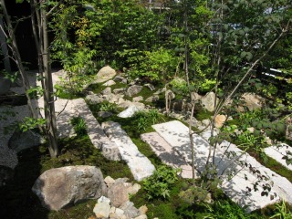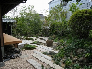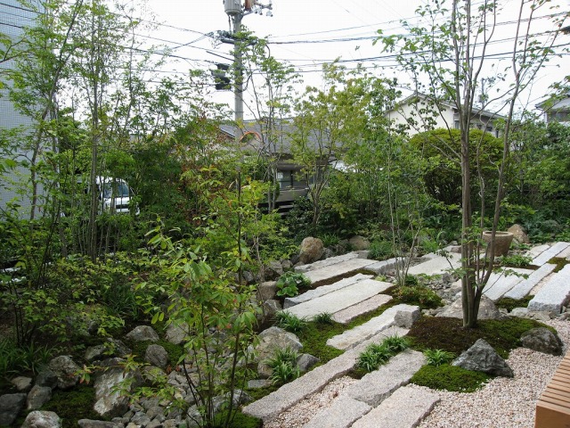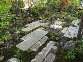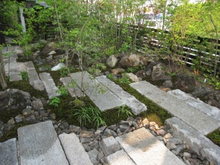 | 長石の外にサビ砂利を敷き、歩く位置を制限しています。これにより、ポイントを絞った景観整備を実施できます。 | とても自然度を高く整備しています。とても住宅地のど真ん中の空間とは思えません。 | |