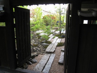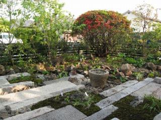 | 奥に赤い花をつけているキリシマツヅジは、古くからお庭にあったもので、現在では入手困難なほど立派なものです。 | 門からの風景です。ドラマチックなシークエンスとなっております。 | |