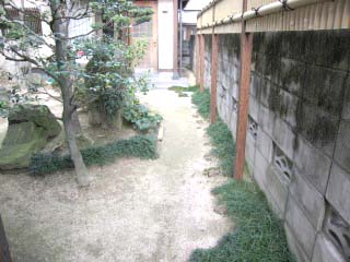 | この建物と、ブロック塀の隙間から、材料を搬入しました。幅が90cmほどしかなかったので、重量の重い材料の搬入は大変でした。 | ||