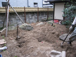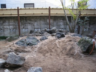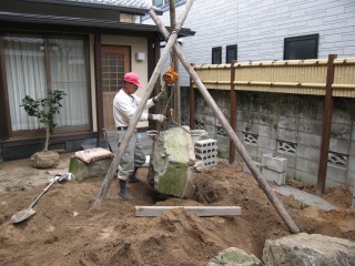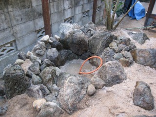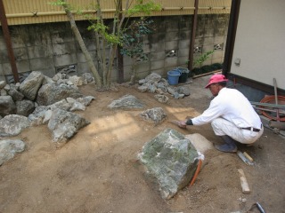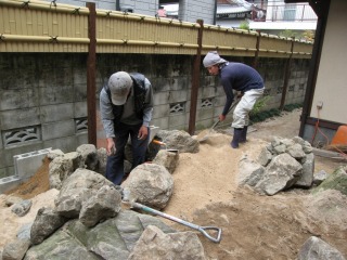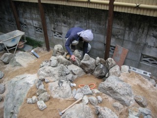 | 既存の石材では足りなかった分を、新たに搬入しました。新たに搬入した石材は、湯来石です。 | 照明部分の石組を形造っていきます。同時に少しずつ客土を行なっていきます。 | |