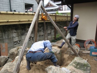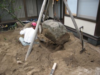 | 新たに搬入した石材も、重たいものは500kg程度あり、チェーンブロックを使っての作業となります。 | ほぼ石組が完成しました。客土で周囲の地盤をかさ上げしてから、上部の石組を行ないます。 | |