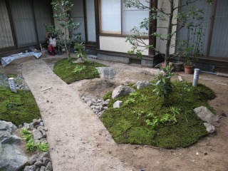 | ほぼ杉苔を張り終わりました。この時点では、張り合わせ部分が線になって目立っていますが、時間が経つと杉苔が生長して分からなくなります。 | 園路の反対側も完成です。砂利を敷くために5cmほど、地盤を切り下げています。 | |