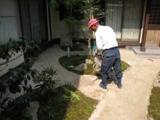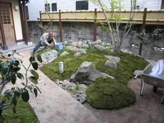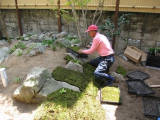| 杉苔を張るために、地面を整形しています。不陸があると杉苔が浮き、その隙間から乾燥して痛んでしまいます。 | 杉苔を張っていきます。パレット状の杉苔を敷き詰め、上から叩いて圧着させます。 | |