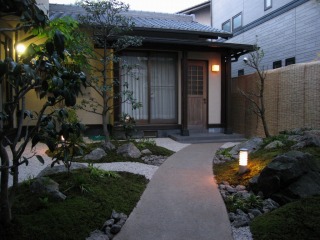 | 庭園灯を新たに設けました。 | 夜でもお庭の景色を楽しめるように、モミジを照らすアップライトを設置しました。 | |