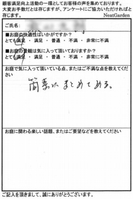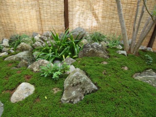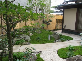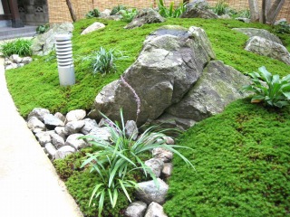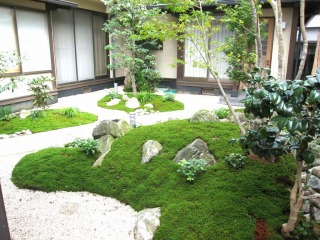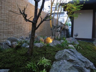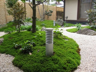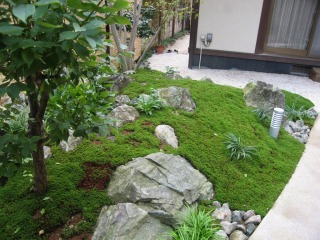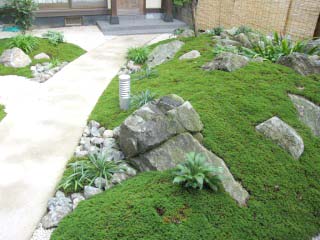 | 三方を住居建築物に囲まれ、残りの一方を隣家に囲まれた中庭を、杉苔の美しい緑色を活かした和風庭園として整備いたしました。四方を建築物に囲まれているため、日照条件があまり良くないのですが、日陰でも良く育つ植物を選定することで、美しい和風庭園となっております。 また、複雑な築山の形状とアンジュレーションで、どの方向から鑑賞しても、変化に富んだ楽しい景観を楽しむことができます。 |