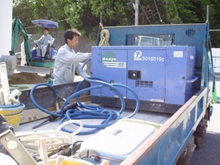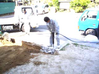 | ブレーカーの動力源であるコンプレッサーです。この機械で圧搾空気をつくり、ブレーカーに送り込みます。 | 敷地ブロックを取り壊したところです。 | |