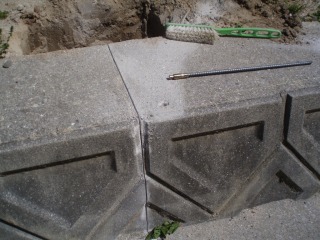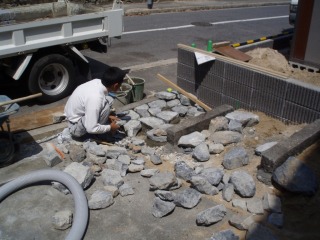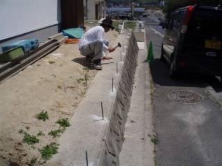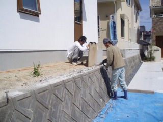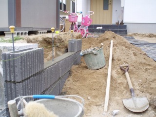 | ようやく化粧ブロックを設置することができます。鉄筋が入っていないと、土圧に負けブロックが壊れてしまいます。 | 階段横の化粧ブロックを積んでいるところです。 | |