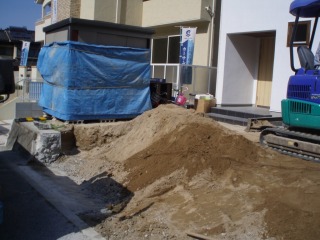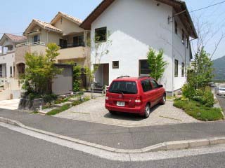 | 2台分の駐車場とアプローチを設けるために、敷地ブロックを取り壊しました。取り壊した後の地盤高を調整するために化粧ブロックを使用しています。 | ||
