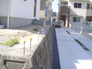 ディベロッパーの設置していた敷地ブロックは、土砂が流出しないという機能だけに特化したものでした。 その敷地ブロックを取り壊すことで、駐車スペースとアプローチとなる階段を設置することができました。 また、化粧ブロックで高さ調整を行うことにより、のっぺりとした空間にアクセントをつけることができました。 |