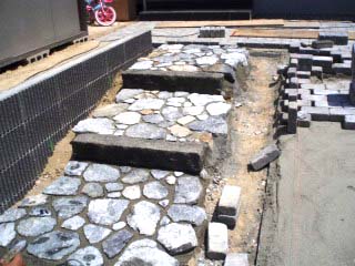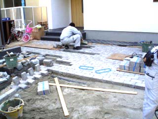 | 石を組み合わせているところです。厚みのある石材を使用しているので、作業性は悪いです。 | 作業性が悪くても、厚みのある石材を使用したため、サイド部分にも石材面が表れ、インターロッキング部分との高低差があっても、見栄えが悪くなりません。 | |