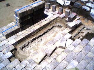 | インターロッキングを敷き並べています。所々に植栽スペースを設けています。 | 植栽スペース部分です。透水性を確保するために、植栽スペースの下は水が抜けるところまで掘り込んでいます。 | |