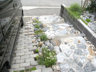 アプローチは石貼りの階段です。蹴上げ部分には長石を使用しております。 貼っている石は、タイルのように薄いモノではなく、大ぶりなものを使用しています。これにより、階段とインターの高低差が大きいところでも、収まりが良くなっています。 |