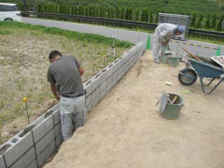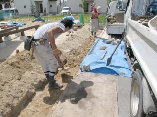 | 地ごしらえと整地をしているところです。後から埋め戻したりする部分を計算に入れた上で、必要のない土砂を搬出します。 | お隣との境界となるブロック塀をついているところです。 | |
