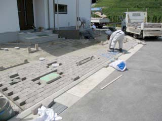 | 駐車スペースにインターロッキングを施すため、整地をしています。 | 落ち着いた色合いのインターロッキングを配置しています。 | |