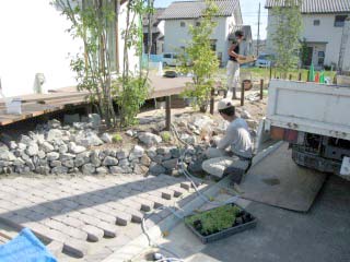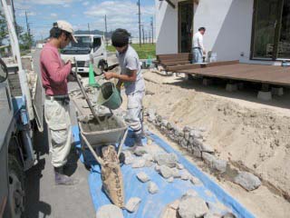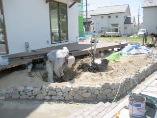 | 石積みが完成したところです。 | 植木を植えるための、植え穴を掘っているところです。土壌改良材を混ぜて植栽します。 | |