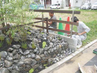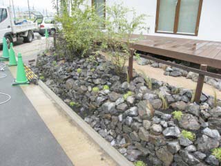 | 石積みの前後に石を配しています。同時に地被植物を植え込んでいきます。 | ウッドフェンスを取り付けています。今回はブロック塀、石積みの段差もあるので、簡易なものとなっています。 | |