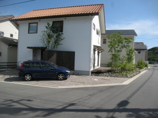 | 表側は駐車スペースとなっています。ウッドフェンスとその内側に植栽を設けています。ペイブメントはインターロッキングです。 | ||
