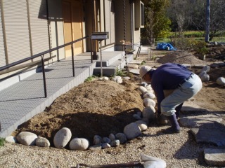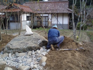 | 骨格が完成してきました。ここからは細かな造作になります。 | 伏した巨石の周囲を、自然石をつかって修景していきます。 | |