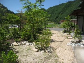 | 休日を過ごされることのある別邸のお庭を、自然風庭園に改修させて頂きました。既存の飛石とツクバイはそのままにしながら、庭の中心を陣取っていた巨石を、自然な形で利用することで、大きく印象を変えることができました。 田舎の特徴として隣家との境に塀などがないため、厚めに植栽を施すことで空間を区切ることにしました。 大田川の中流域に位置するため、大ぶりな川石を利用しましたが、プランどおり周囲の景観にマッチしていると思います。 |