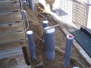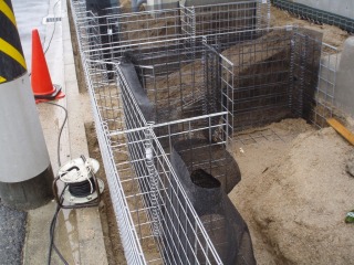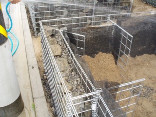 | 予め地盤の高さまで、管類、マス類をかさ上げしておきます。地盤高を変更する際には、排水にも気をつける必要があります。 | メッシュフェンスを組み立てます。また境目にメッシュシートを設置します。 | |