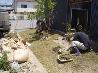 | 二重構造となっており、外側には石材を積め、内側には土壌を入れていきます。 | 斜面部分に芝生を貼っています。傾斜地や立ち上げ面は、水分が少なくなりがちなので、土壌改良をしっかりと行います。 | |