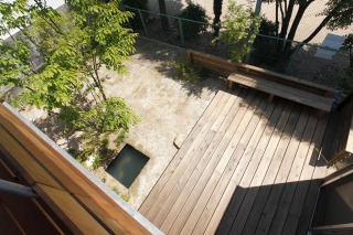 | 中庭部分を2階から見たところです。地盤を上げているので、ウッドデッキと高さの差があまりありません。 | 小さな池を設けています。また左側の木は、やはり地盤を立ち上げて植栽しています。 | |