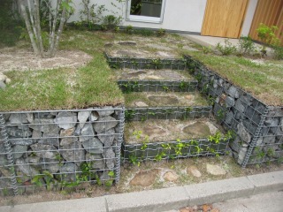 | 階段部分です。踏面には自然石を配置しており、安全に歩けるようになっています。 | 石積み部分です。フェンスが支えてくれるので、普通の石積みと異なり、石の組み合わせを考える必要がありません。 | |