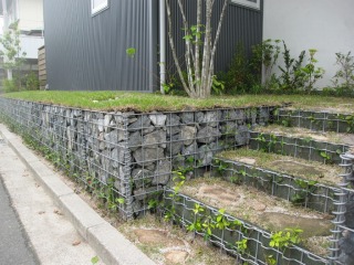 メッシュフェンスを使うことで、垂直に石積みを立ち上げています。垂直に立ち上げることで、敷地の有効面積が減少しません。 また、石積みの表面と、天端の芝生、建築物が、うまく一体となっており、変化に富んだ景色となっています。 |