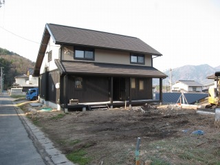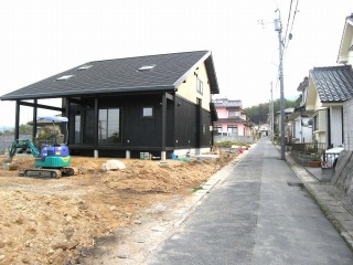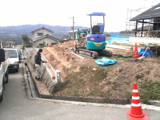| 現状で最低限の擁壁しか設けてありませんでしたので、土留めおよび景観を考慮して、化粧ブロックを積んでいきます。写真はそのベース工事です。 | 住宅外装が完成しました。こうなるとイメージが湧きやすくなり、俄然仕事のペースがあがります。バックホウで敷地基面の整正を行っています。 | |